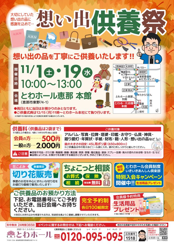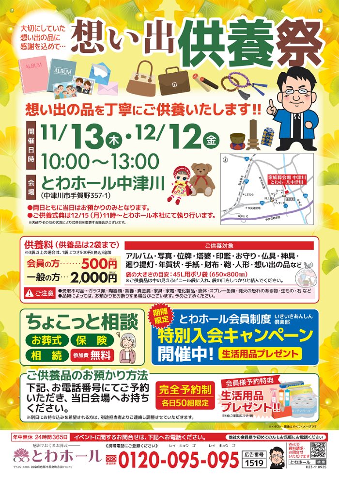 想い出供養祭 とわホール中津川【中津川市】 - 大切にしていた想い出の品に感謝を込めて—— とわホール中津川(中津川市手賀野…